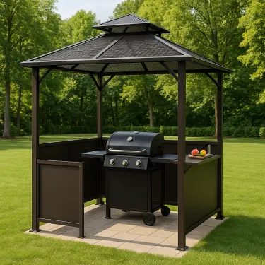 Este kiosco para jardín combina un diseño clásico y elegante con funcionalidad y durabilidad, convirtiéndose en el lugar ideal para relajarse y disfrutar del paisaje exterior. Fabricado en madera de alta calidad, presenta un acabado marrón natural que se integra perfectamente en entornos verdes y floridos. Sus amplias ventanas decorativas permiten una excelente ventilación y entrada de luz, creando un espacio acogedor y luminoso. El techo a varias aguas con tejas proporciona una protección efectiva contra la lluvia y el sol. La instalación es simple, ofreciendo una estructura estable y resistente lista para disfrutar.