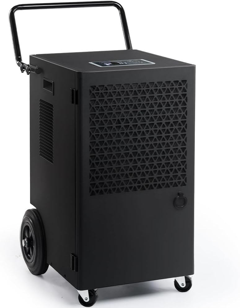 Este deshumidificador elimina hasta 70 L de humedad diariamente en áreas de hasta 200 m2. Ofrece un rango de ajuste de humedad y soporta deshumidificación continua, manteniendo la humedad establecida con precisión. Dispone de una función de temporizador flexible de 1-24 horas, permitiendo un control sencillo del encendido y apagado. Debido a su refrigerante R290, incluye protección del compresor, temperatura, y alertas de depósito lleno. Su sistema de descongelamiento automático garantiza la estabilidad. Diseñado para un fácil mantenimiento con opciones de drenaje en un tanque de 5.5 L o a través de un tubo. Hay un recordatorio de limpieza del filtro cada 30 días o 720 horas de uso. A pesar de generar algo de ruido, es adecuado para almacenes y laboratorios debido a sus ruedas móviles y frenos.